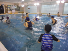 プールに入る前に、ゆったりとした音楽の中で、全身の筋肉を伸ばすストレッチ体操をします。その後、お家でも出来るような簡単なひきしめ運動をして、プールへ移動します。