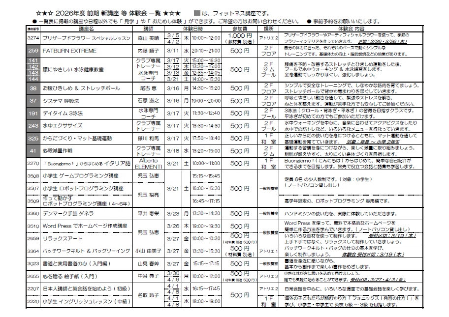 フィットネス&カルチャークラブでは、2026年度 前期 開講 に向けて、各講座の体験会を開催いたします。