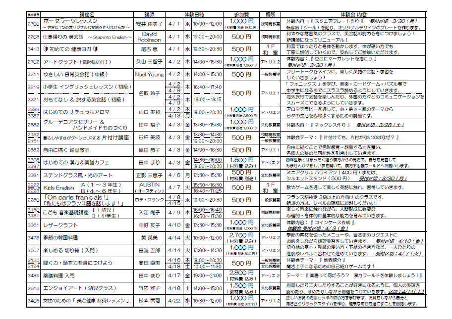 ※ 体験会の時点で定員に達した講座は、その後の募集を行わない場合があります。